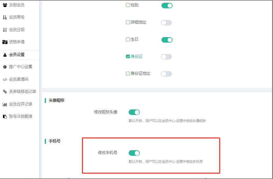 会员资料设置增加前端修改手机号按钮是否显示开关