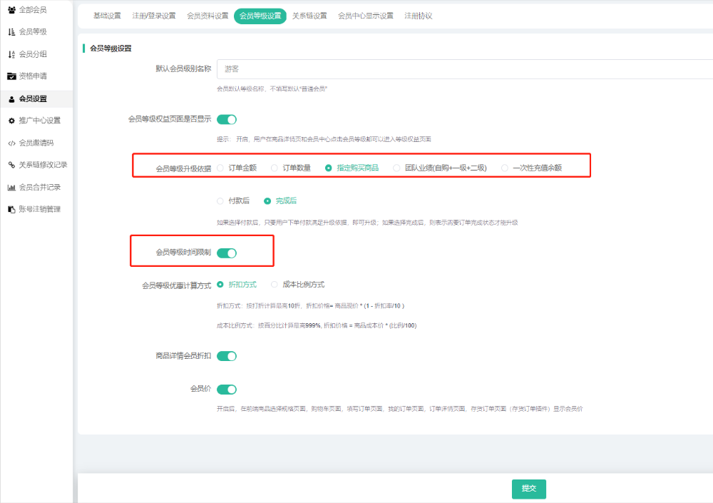 1、会员支持设置多个会员等级,详情可查看会员--会员等级模块;这里设置会员等级升级的依据,即会员根据什么条件进行升级;
