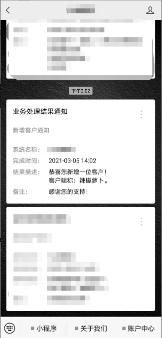 会员获得推广权限/新增客户,通过微信公众号进行推送公众号信息