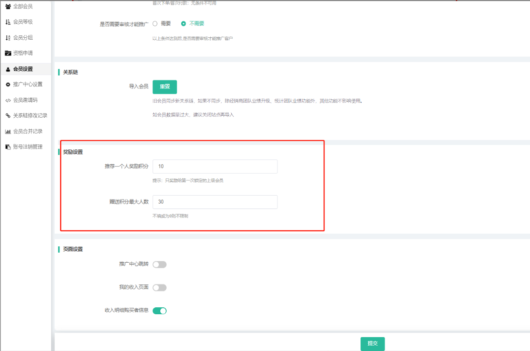 成功推荐会员绑定成为下线后,可以奖励X积分,增加积分最大人数X人,提示:只奖励给第一次锁定的上级会员.