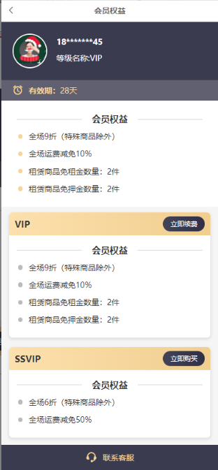 提示: 开启,用户在商品详情页和会员中心点击会员等级都可以进入等级权益页面,效果如下