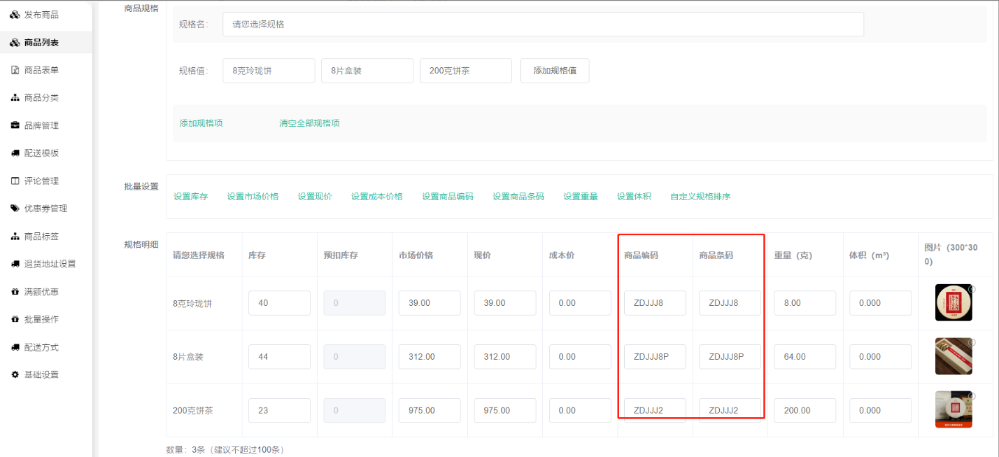 同一个商品同规格内的编码、条码可以填写一样,但不同商品、不同规格之间编码、条码则需要填不一样的,这是推送到第三方那边显示出来的编号,用来区分商品的。编码条码可以随意自行生成填写,也可以根据商品实际的编码填写。