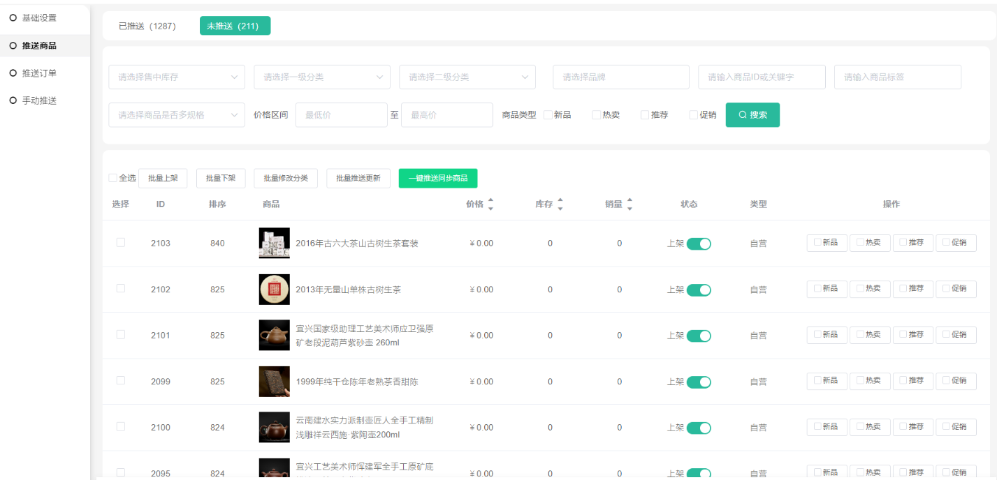 推送商品:列表中是商城自营的商品,推送的商品一定要填商品编号、规格,不然会导致推送会失败。
