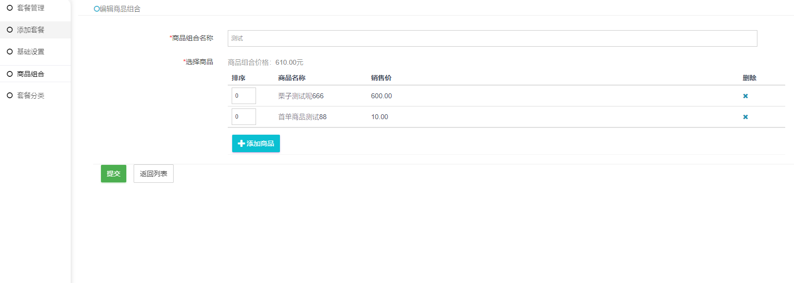 ⑤套餐商品:需要左侧菜单栏先添加好商品组合,再进行添加组合套餐