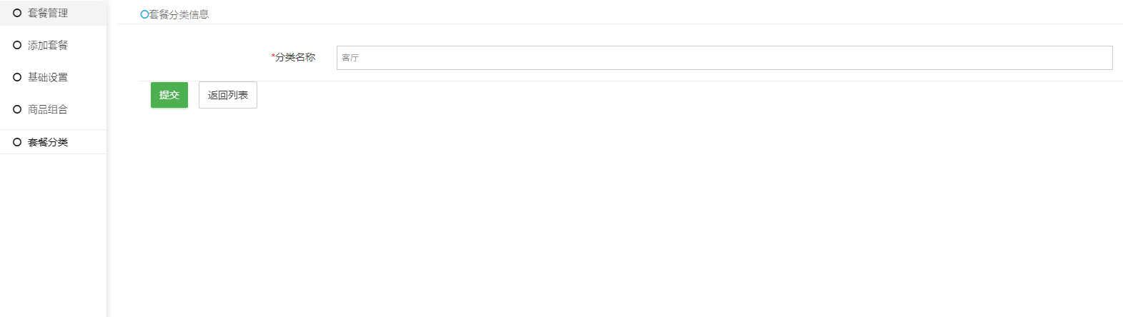 ④套餐分类:需要左侧菜单栏先添加好套餐分类,再进行选择对应的分类