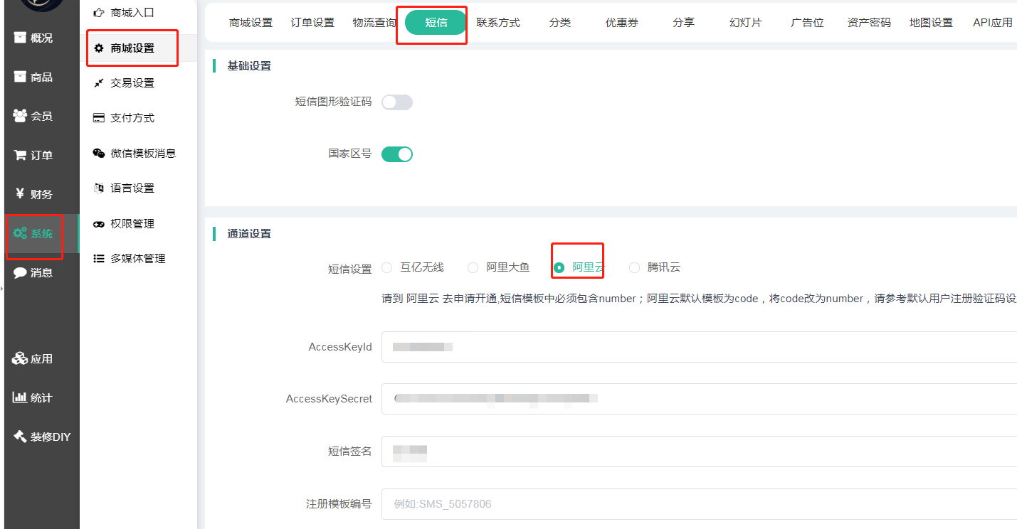 8.管理后台:系统-商城设置-短信-阿里云-填写