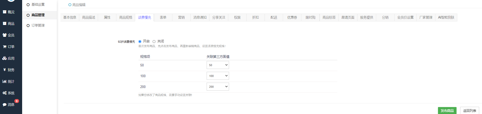 发布商品后可通过规格关联充值面值。