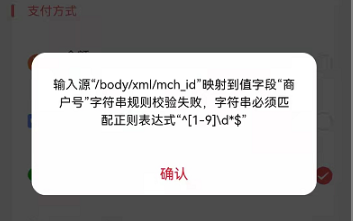 六、支付提示输入源"/body/xml/mch_id"映射到值字段"商户号"字符串规则校验失败,字符串必须匹配正则表达式"