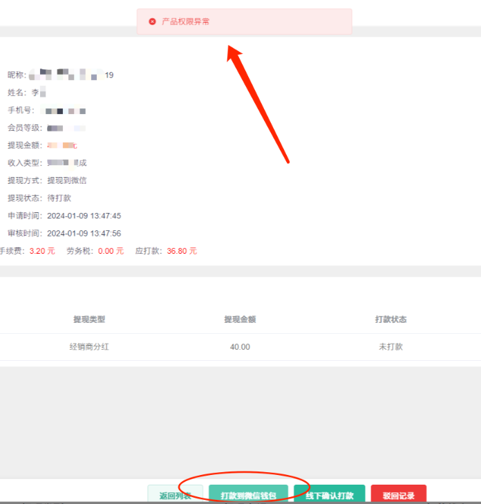 十三、用户提现到微信,后台打款提示提现失败,NO_AUTH-产品权限验证失败,请查看您当前是否具有该产品的权限;或者提示产品权限异常