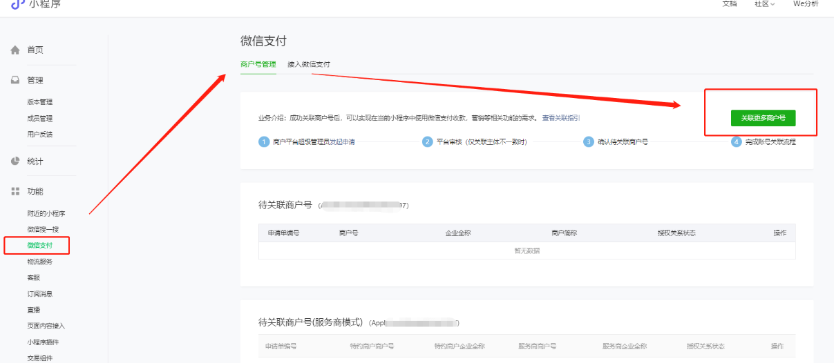 登录小程序平台mp.weixin.qq.com,检查左侧菜单“功能”显示的微信支付是“微信支付”,还是“支付管理”。若显示微信支付,商城后台小程序支付类型对应选择微信支付的。选择后配置好小程序关联的商户号,支付密钥和上传商户证书。